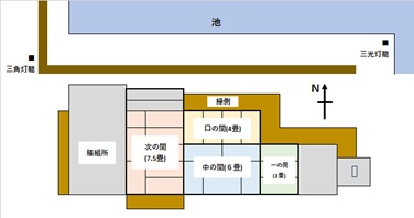 新しい書院は、古い書院に対して、南に接しながらも、西へずらして配置されており、