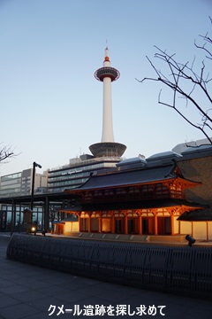 その羅城門復元模型越しに京都タワーを見たところ。